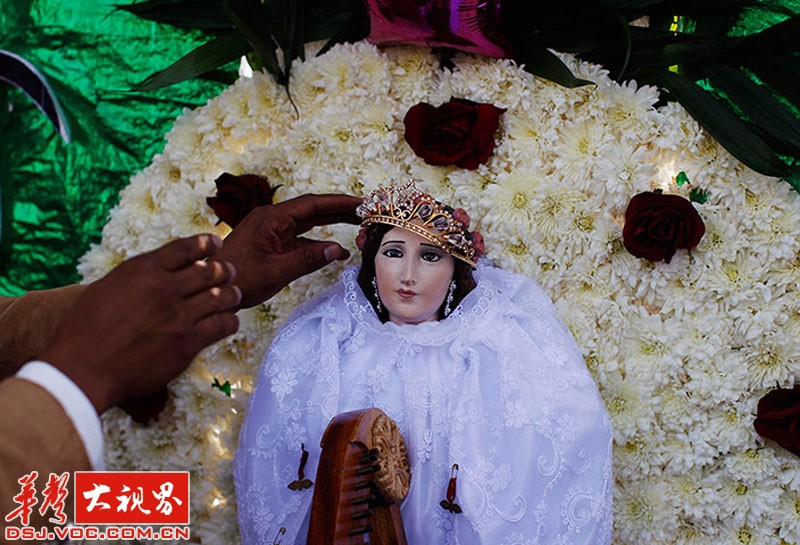 墨西哥,墨西哥城:在到瓜达卢佩的圣母大教堂朝拜期间,一个流浪汉在整理圣母玛利亚图像上的皇冠。