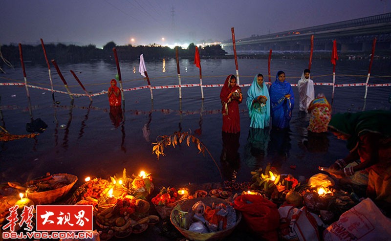 印度,新德里:一年一度的哈特普迦节期间,人们聚集在亚穆纳河里,向太阳神祈祷。在印度教义中,人们相信太阳神治愈了人类的数种疾病,并且能保佑亲友和家人健康长寿。