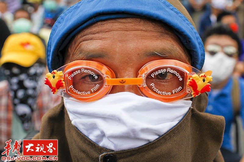 泰国,曼谷:在一次大的反政府游行中,一名抗议者带着游泳镜和棉布口罩以防被催泪瓦斯伤到。