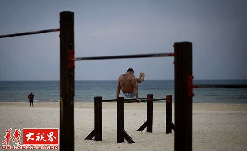以色列,阿什杜德:宣布停火之后的一天,一个男人在沙滩上锻炼。