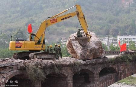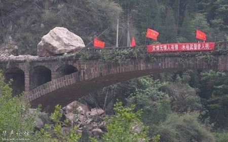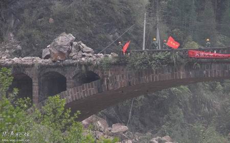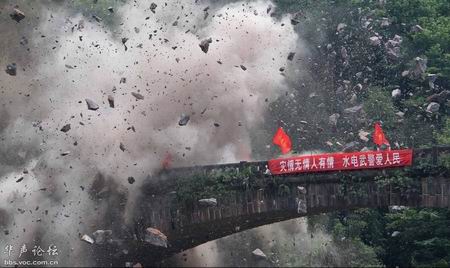 桥坚强:4月22日下午,随着宝盛大桥上一块约250吨重巨石的爆破清除,龙门至宝盛的道路打通。宝盛大桥因地震、滚石和爆破都不倒,这让一车烟花就炸倒了的桥情何以堪