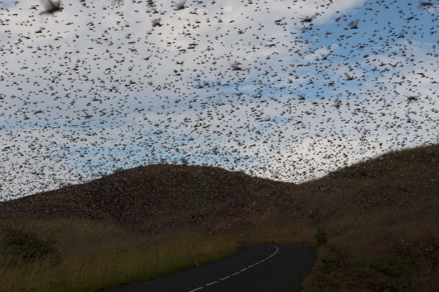 【核心提示】5月4日,在距离马达加斯加首都塔那那利佛西南600多公里的曼多陀村,一名当地居民观看蝗群飞过35号国道。