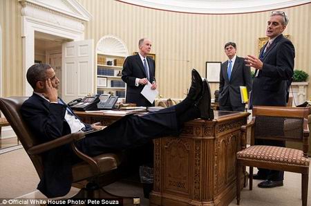 英国《每日邮报》5月1日曝光了一组美国总统奥巴马的办公照片。原来总统先生也有怪癖——白宫内无论大小场合,这位随性自然的总统总是随意地将脚跷在桌上,毫无“规矩”可言。