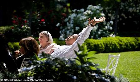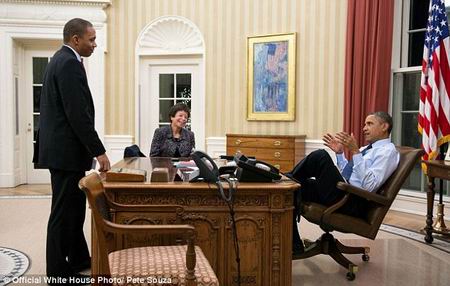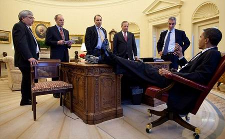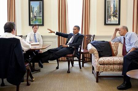 照片中,奥巴马总是在紧张严肃的氛围下表现出放松的状态——双腿交叉,膝盖稍弯地跷在桌上。无论是与白宫职员商讨国事,还是坐在会议桌前听取各方政见,亦或与同事在玫瑰花园享受春日阳光,这位总统总是习惯性地将双腿放在面前的桌子上。