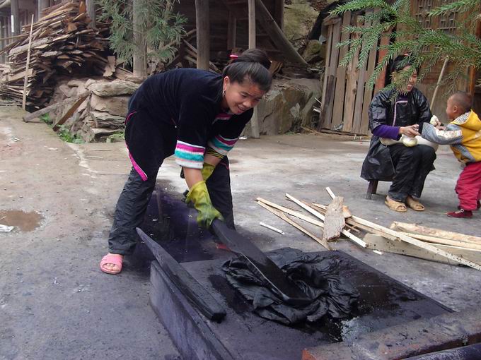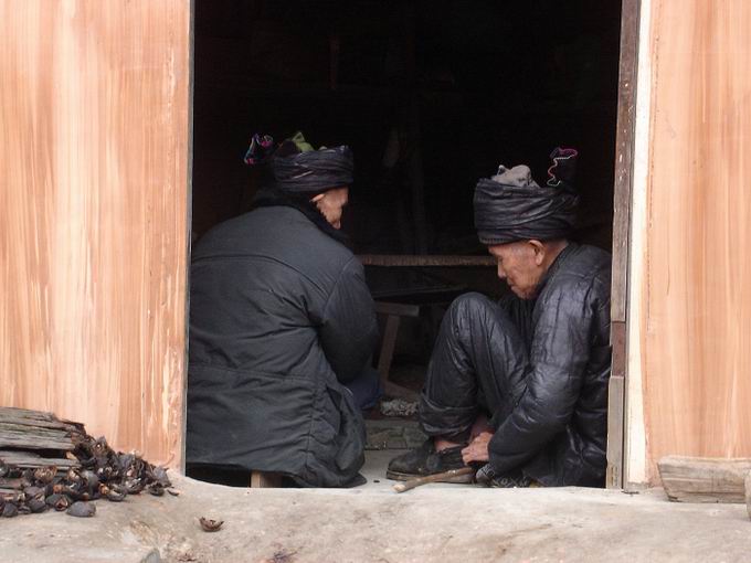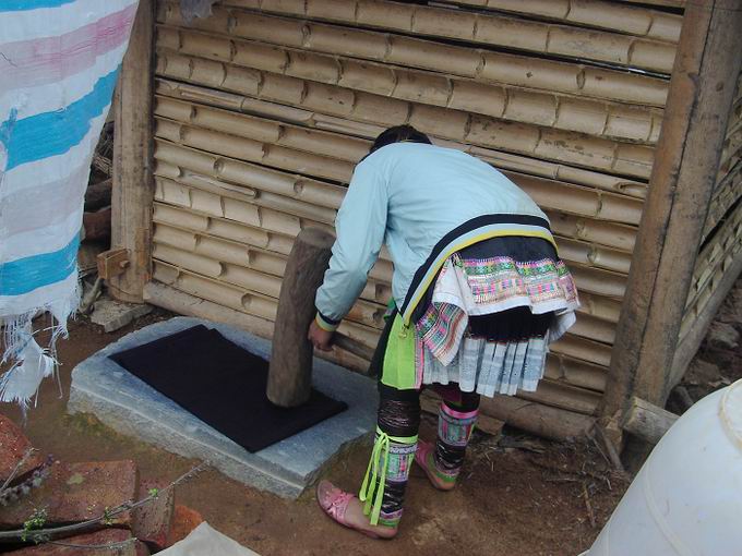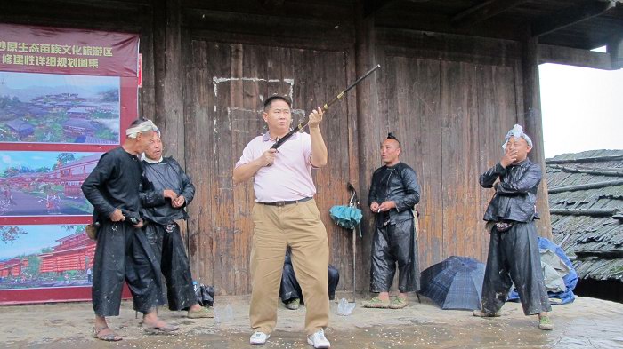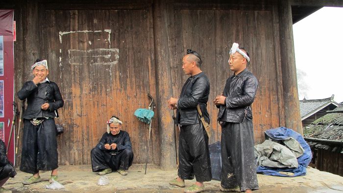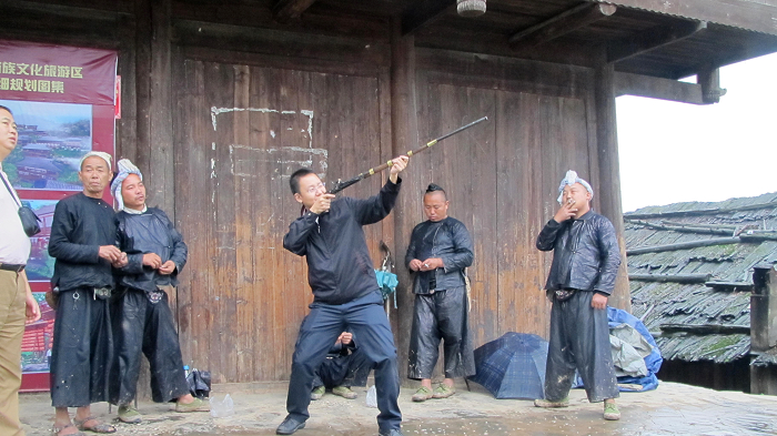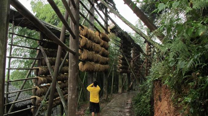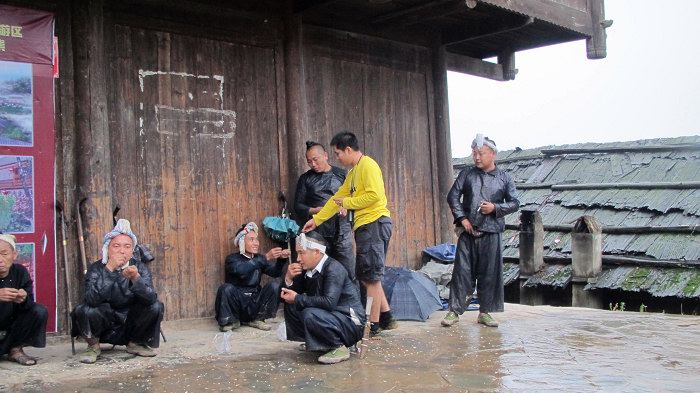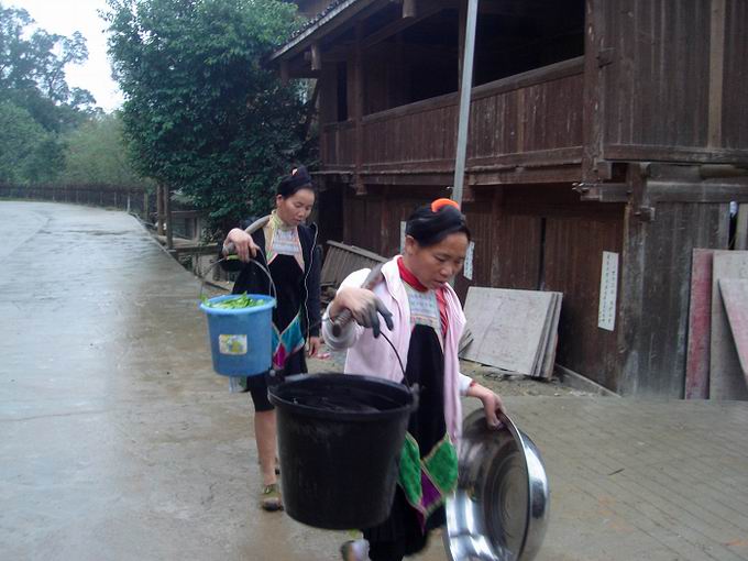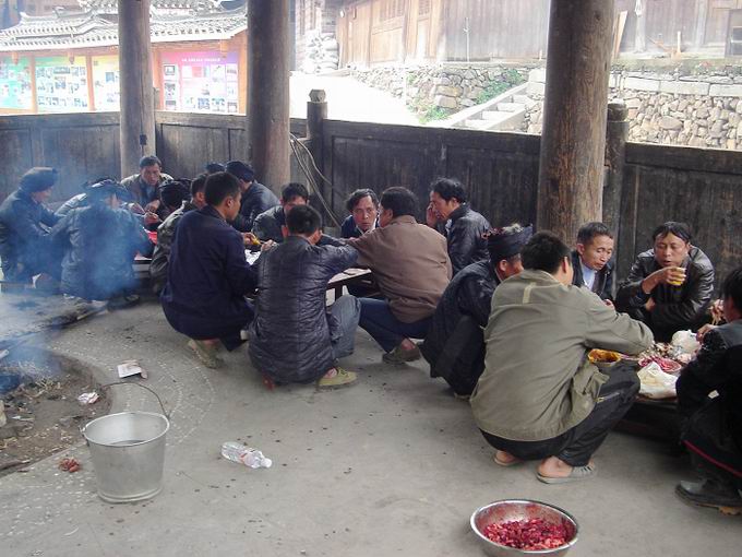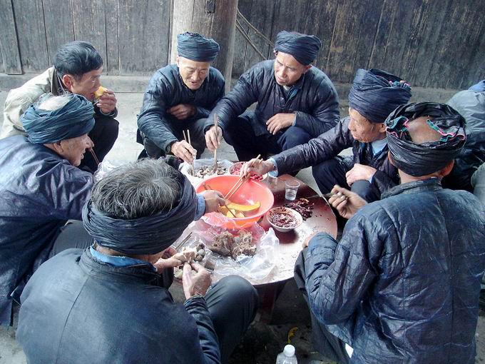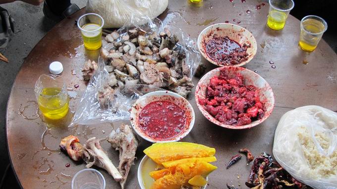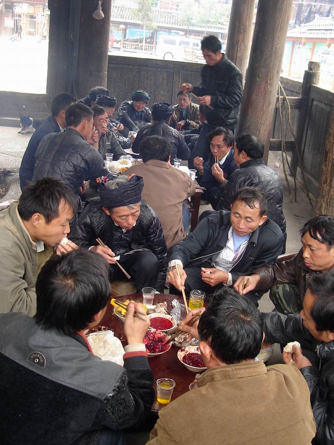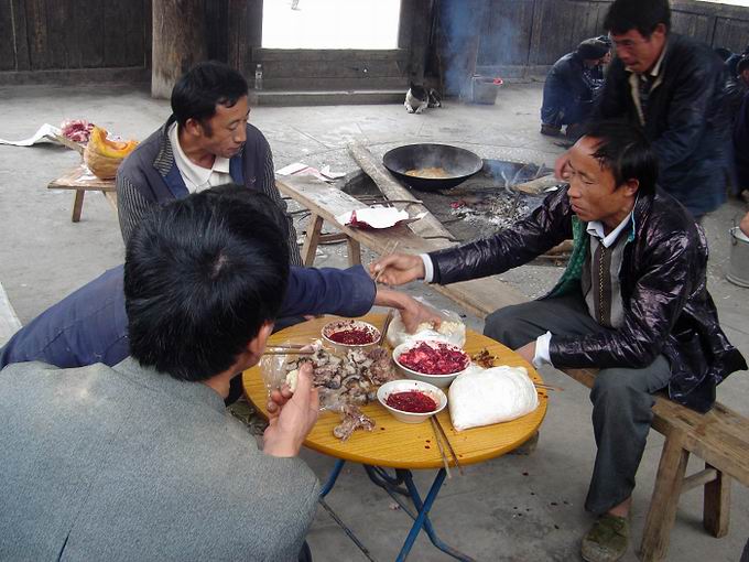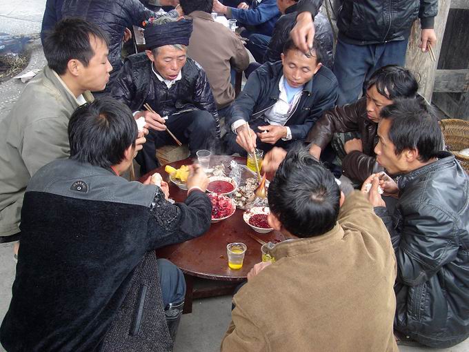 靠近村里的鼓楼,刚开始感觉就是人多,在一起吃饭,等慢慢靠近,细看过后,还真吓了一跳,居然吃生猪肉?????bq147 他们见我好奇,很热情地邀请一起吃。既然来到了,就亲自体验一下嘛,但我还是不敢吃那生猪肉,因为他们说这不是肉,是内脏,生内脏跟生猪血一起捞着吃,皮和肉用来烤。最后我还是强忍着吃了一块烤肉。他们吃饭是用手,一人抓一把糯米饭,就这样吃。酒呢,是用一个桶装的,是猪胆酒,要的话用一次性的杯,一勺就行。水呢,也是用桶装的,一个大勺,大家都是用勺来喝。