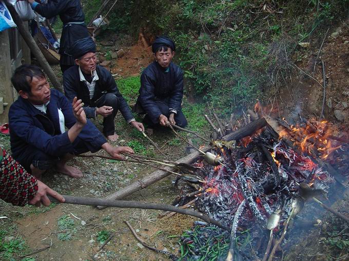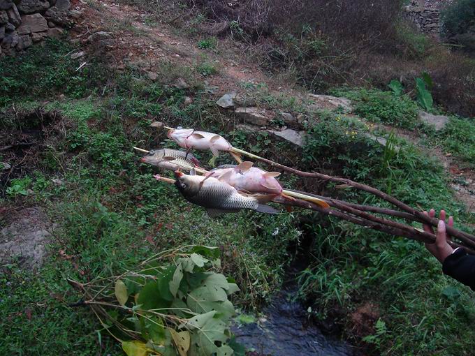 路上看到收割水稻。有意思的是,他们干活累了饿了不回家吃饭的,把田里的鱼抓上来,用准备好的木棍一条一条地串好,围一堆火,大家拿着来烤,熟了沾点盐,吃了继续干活。俺问:“不用去掉肚子里脏东西的吗?”“不用,自己田里的干净得很。”