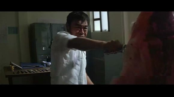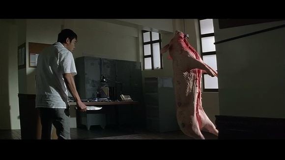 青云哥扮演的神探,手持一把刀,在围着一头吊起来的死猪转悠,