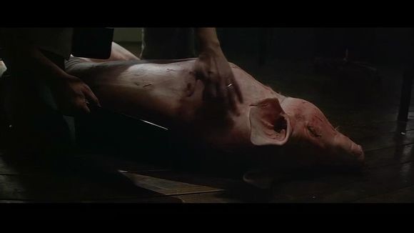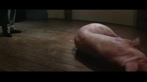 最后一张图,注意神探表情,很纠结,挣扎的看向那头死猪。他在模仿嫌疑犯的心理活动,吊起来的死猪,代表受害者。