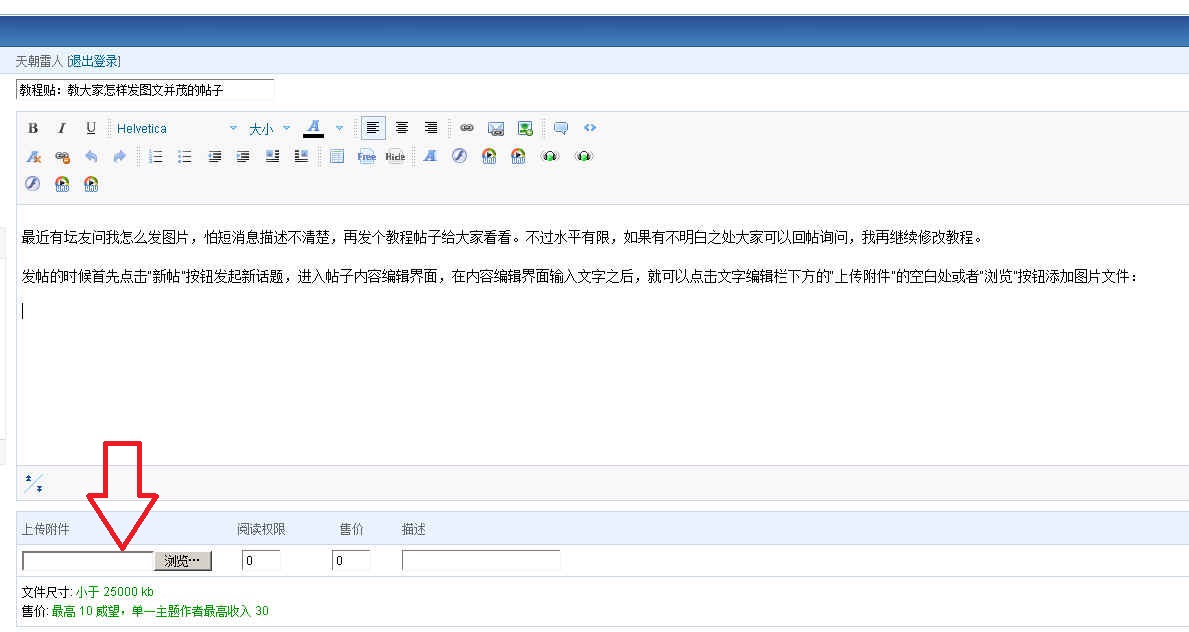 发帖的时候首先点击“新帖”按钮发起新话题,进入帖子内容编辑界面,在内容编辑界面输入文字之后,就可以点击文字编辑栏下方的“上传附件”的空白处或者“浏览”按钮添加图片文件: