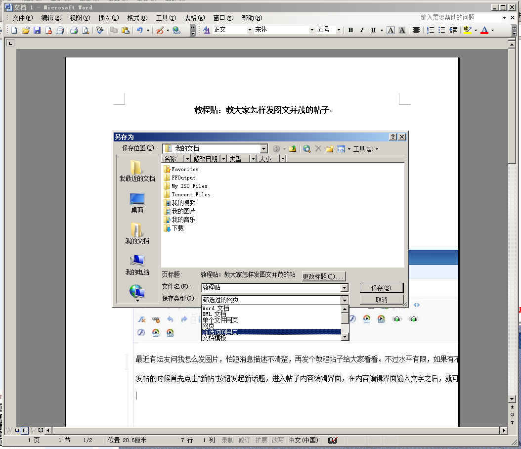 5、再然后就是最重要的一步!大家一定要注意看!最后一步做不好就会前功尽弃的!要点击word文档左上角的  “文件” ···>  “另存为” ,然后 “保存类型” 一定要选择“筛选过的网页” 这种格式,然后再保存。