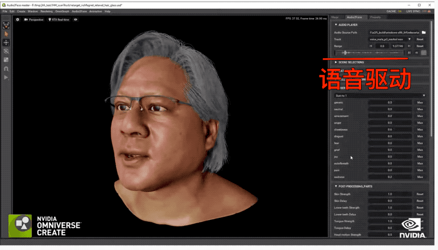 就像这样,用上最新的Audio2Face模型,AI可以随着语音播放自动调整模型的面部动作表情。