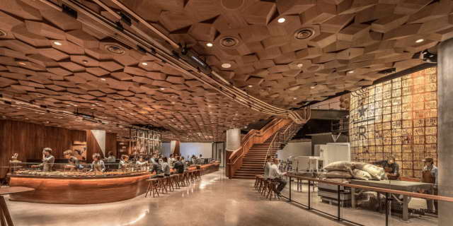 2017 年,星巴克就在上海南京西路开了个 2700 平米的臻选烘培工坊,搬来了咖啡烘焙流水线,还砸钱做了 N 多细节,比如顶部设计了 “咖啡交响管” ,烘培好的生豆通过管道乒乒乓乓的最后掉落到吧台的储豆罐里。