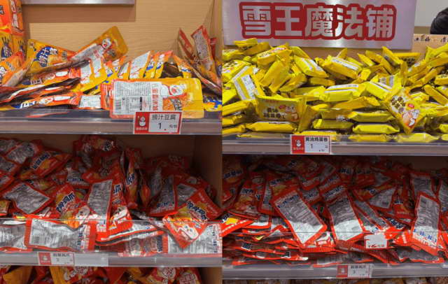 小零食区则过成了 2 元店的样子,黄油鸡蛋卷、捞汁豆腐都只要 1 元,脱骨凤爪 3 元,感觉只要进来了,很难空着手出去。