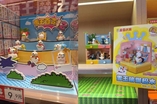 二层卖文创周边跟小零食,不少 9.9 元的盲盒,大一些的盲盒跟积木在 30 元左右,也有上百元的贵货。