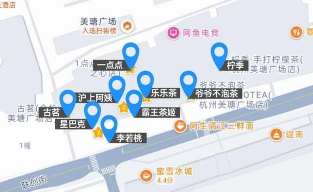 这是我们公司周围的商圈,就这条街,有 9 家饮品店,店与店之间最远的步行距离就 150 米左右。