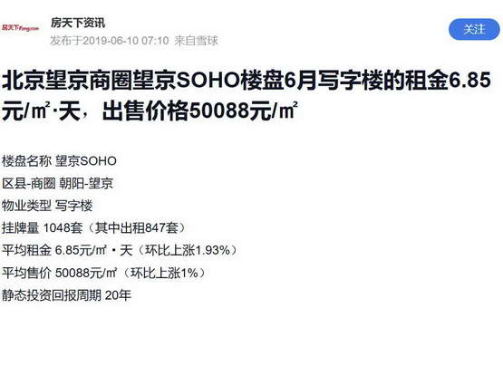 图 2,2019 年 6 月的资讯:望京 SOHO 的当时的租金是 6.85 元 /m2。
