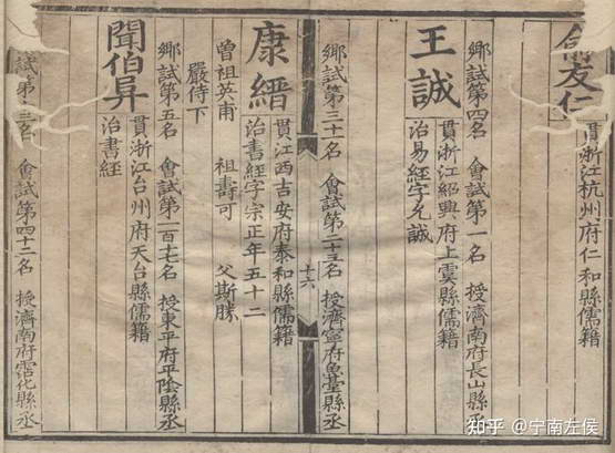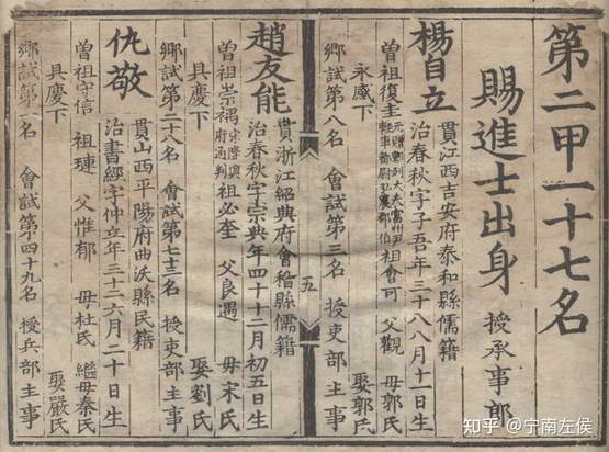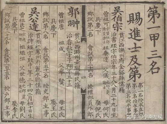 洪武四年明朝第一次科举,一共录取 120 人,一甲 3 人两个儒籍,二甲 17 人十一个儒籍,三甲 100 人其中一个高丽人没有户籍种类,剩下的 99 人五十一个儒籍。密度之大,甚至能出现一页四人全部是儒籍的盛况: