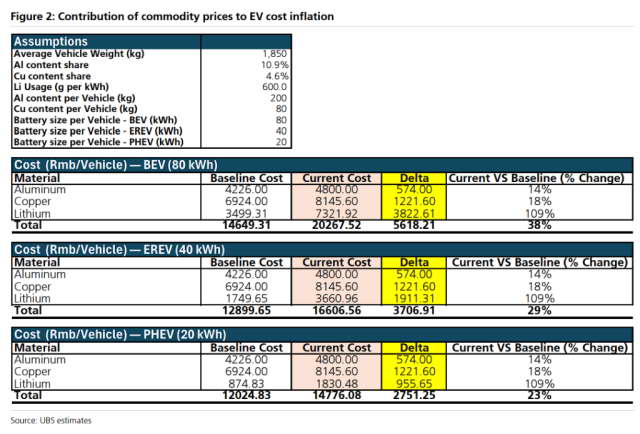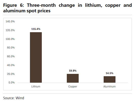 比如在上周一,瑞银就发布了一份报告,说过去三个月内,锂涨了 115.4% ,铜涨了 19.9% ,铝涨了 14.5%?,将导致一辆中型电车的生产成本提高 4000 到 7000 人民币。