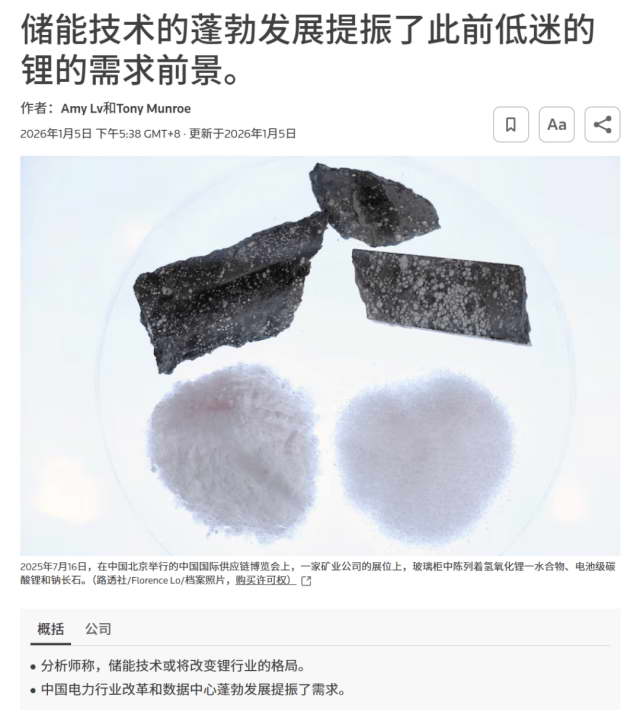 在不久前,路透社就表示,中国及全球的数据中心建设,大力推动了储能领域的需求增长。继 2025 年碳酸锂需求增长 71% 之后,2026 年又预计增长 55%。