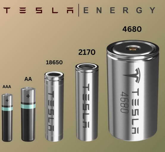 特斯拉一直是用圆柱电池,从最开始的 18650 (直径 18mm 高度 65mm),到现在的主力 2170 (直径 21mm 高度 70mm),体积不算大,也就比常见的 5 号电池大一丢丢。