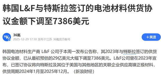 因为就在一个多月前,韩国电池材料厂商 L&F 宣布一条消息是,他们和特斯拉签署的高镍正极材料长期供应合同,金额被削减了 99% 以上,项目几乎凉凉。