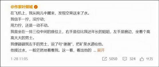当时她接到空乘送的矿泉水,想喝,拧不开,就她下意识找身旁的男士。