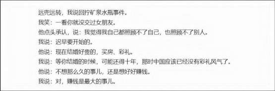 在攀谈过程中,作家还得知这位大四学生还在实习,是新一代的小镇做题家,然后聊来聊去,兜兜转转又回到了拧矿水瓶问题上。