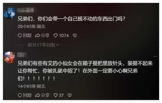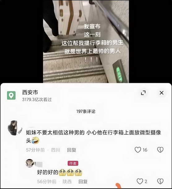 有陌生男生帮她拎行李箱下扶梯,一位网友就觉得 ” 这种男的可能在你行李箱上放微型摄像头 “,结果她竟然迎合这种揣测。