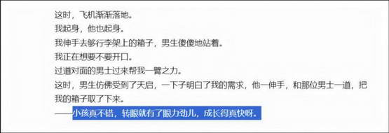 但很快她发现自己又想多了。因为下机时看到作家伸手去够行李架上的行李,他又一次站着不动。