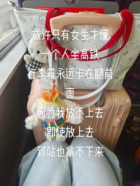 最近一个女生发抖音说:” 或许只有女生才懂一个人坐高铁,行李箱永远卡在腿前面,因为我放不下去,即使放上去,到站也拿不下来。”
