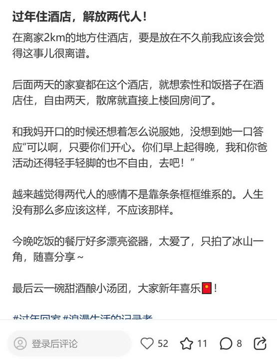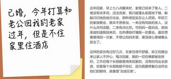 社交媒体上,互联网上关于今年春节女人回家住酒店还是住家里的讨论已经非常激烈。
