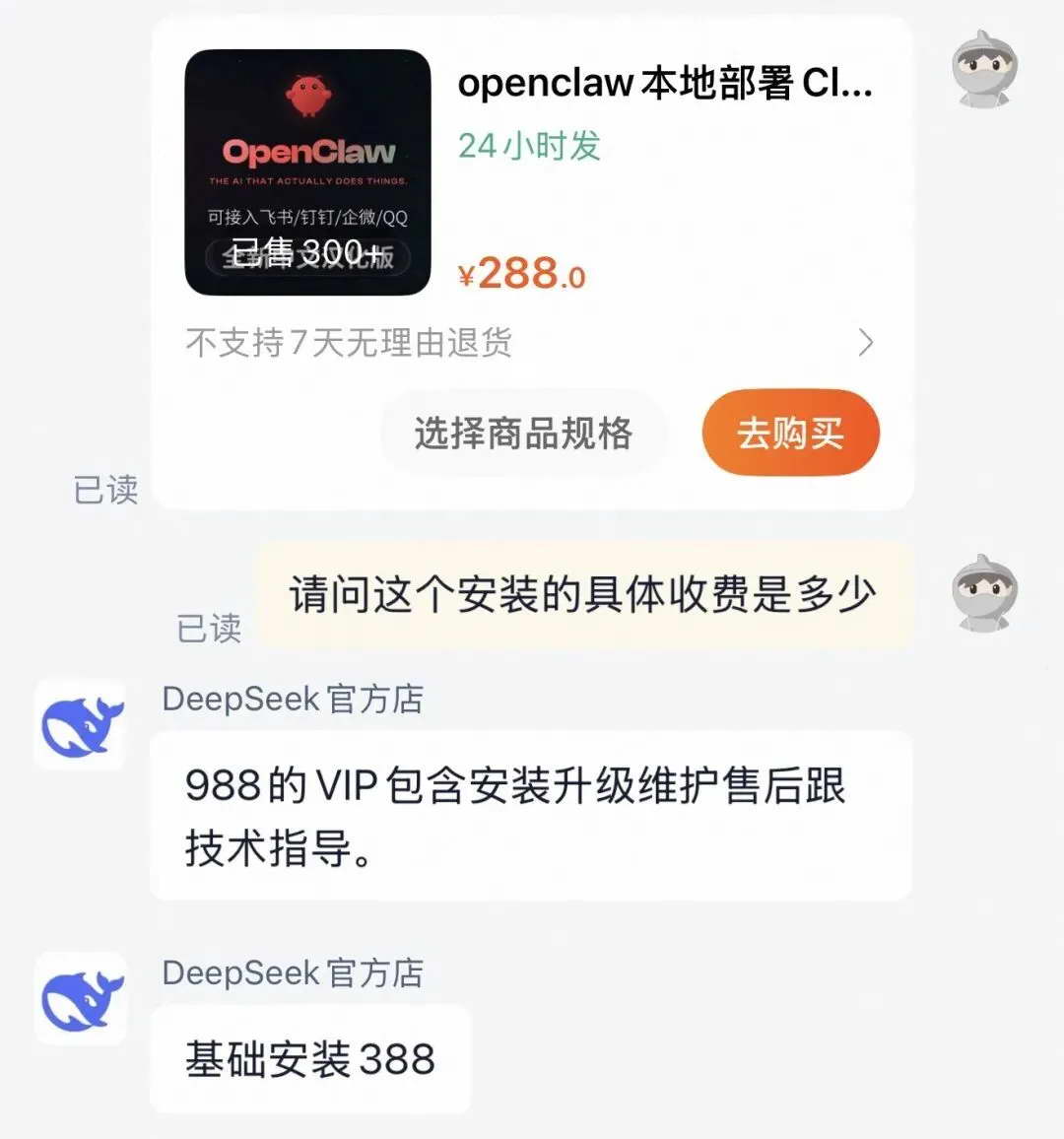 恩,DeepSeek 官方店卖 OpenClaw 的部署,基础安装 388,总感觉这店像是梁文锋他家二舅开的。。。