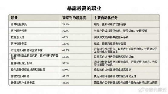 – 图 2 显示了首次指标影响最大的 10 类职业,程序员位居榜首,暴露风险高达 75%,这和 AI Coding 的发展趋势保持一致;