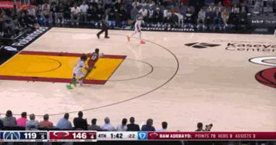 最后一节,出现了神奇的一幕,尽管华盛顿奇才开始包夹阿德巴约试图控制他的得分,但是热火队开始采用战术法规,送奇才球员上罚球线,然后进入自己的进攻回合,为阿德巴约争取更多的进攻时间和得分机会。有意思的是,奇才队也开始采用战术犯规,送热火其他球员站上罚球线,为的是尽量避免阿德巴约得分。