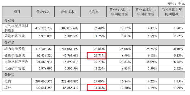 不过这都赶不上出海赚钱,宁德在境内的毛利率是 24%,但在境外却能达到 31.44%。