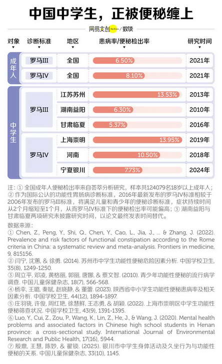 即便是根据更早的罗马 III 标准,苏州中学生检出率仍达到 13.53%,甘肃临夏也有 5.37%[4][5]。