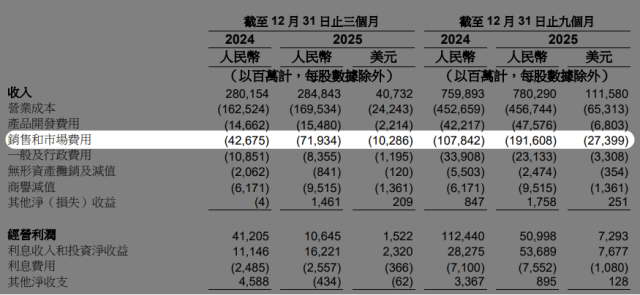 根据最新的财报,去年 9 月到 12 月,阿里销售费用为 719.34 亿元,而 2024 年同期是 426.75 亿,同比暴涨 68.56%。