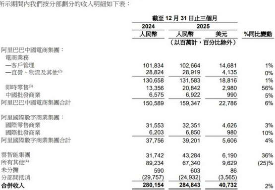 阿里巴巴 2026 财年第三财季,营收同比增长 2% 至 2848.4 亿元,经调整净利润同比下降 67% 至 167.1 亿元。