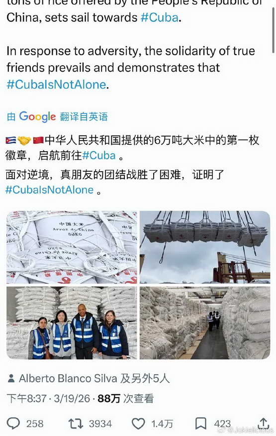 @Jokielicious:在我的首页全都是屠杀和轰炸的时候刷到了中国向被美国断能源断粮的古巴提供了六万吨大米的新闻 [苦涩],古巴不孤单。
