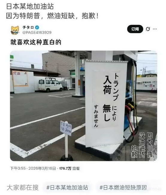 在日本北海道函馆市,一家私营小加油站因为高配汽油和柴油惨遭断供,老板一气之下,在店面挂出了一张白纸黑字的告示:“因为特朗普,燃油短缺,抱歉!” 。