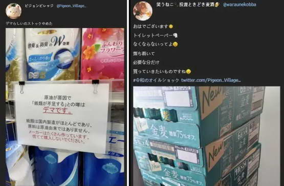 日本人也再次发扬了他们的传统艺能 —— 抢厕纸。3 月 13 日,《朝日新闻》报道,日本社交媒体上 “要在第二次石油危机来临前囤厕纸”、“我在考虑大量购入” 等帖子迅速扩散,仿佛 1973 年 11 月石油危机、2022 年新冠疫情的 PTSD 再次上演。41 家厂商联合的日本家庭用纸工业协会随即出面喊话:厕纸根本不会短缺,请大家不要过度购买。