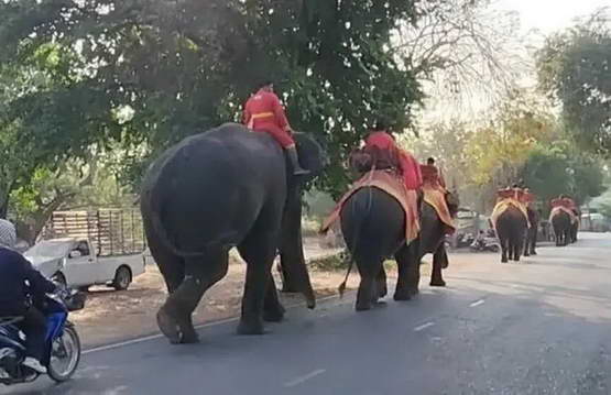泰国大城府历史公园是世界文化遗产,世界各地的游客可以骑着大象游览 18 世纪阿育陀耶王朝的遗址。过去,大象每天清晨坐着卡车从象舍被运送到工作地点,才开始悠哉悠哉服务人类;但从 3 月 18 日起,由于无法确保卡车所需燃料,15 头大象只能排着队,自己步行五公里去 “打工”,这只画风清奇的队伍一路上吸引了不少居民围观。