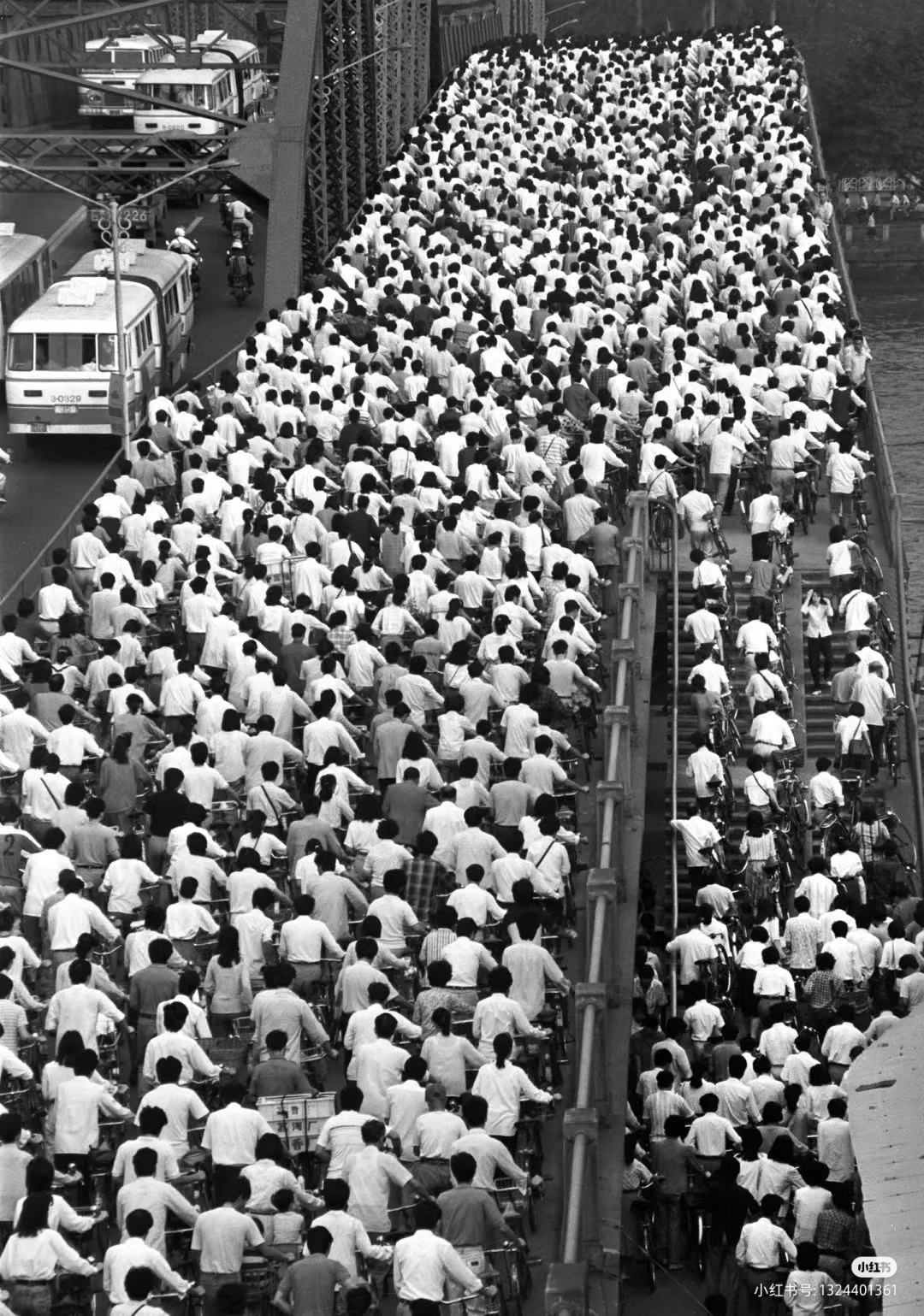 » 1988年,广州街头,骑车上班的人和川流不息的人群。