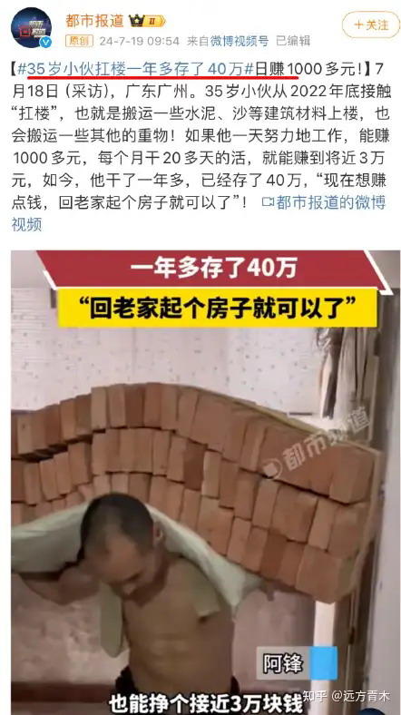 最近一个名叫“35岁小伙扛楼一年多存40万”的视频在网络上走红,引发了广泛关注和热烈讨论,甚至引来了媒体的纷纷报道。