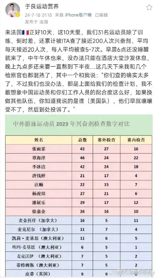中国游泳队在巴黎遭遇了极其苛刻的兴奋剂检查,10天被查了200人次,平均每个运动员每天被检查5~7次兴奋剂,工作人员突然出现让你尿尿你就必须立刻尿尿那种。