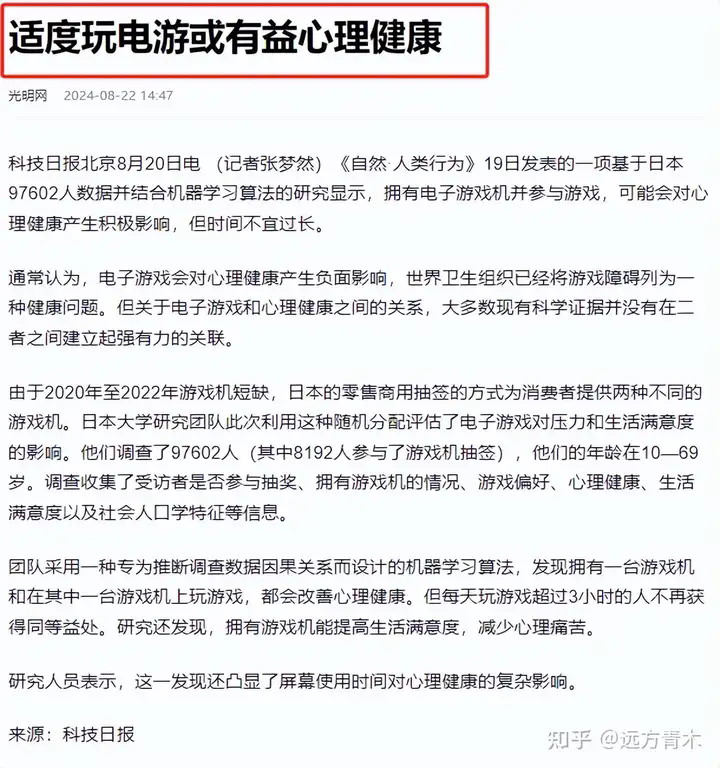 而中国大陆这边,光明网在8月22日发文,题目是《适度玩电游或有益心理健康》。