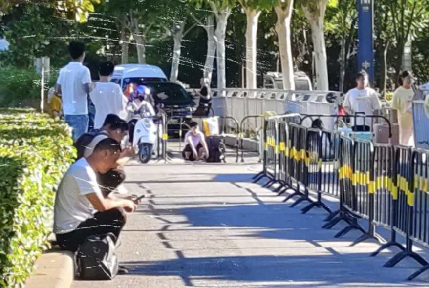 G 南区旁就是港区富士康的招募中心。8 月 12 日早晨,距 8 点正式开门还有十几分钟,等着面试的新工人已零散排出十几米,有人拉着行李箱,也有人在马路牙子上或蹲或坐。电子喇叭反复播报着一个男低音的防骗通知:“未穿蓝色马甲的不是工作人员,不要理会,避免被骗、丢失财物或无法入职。”