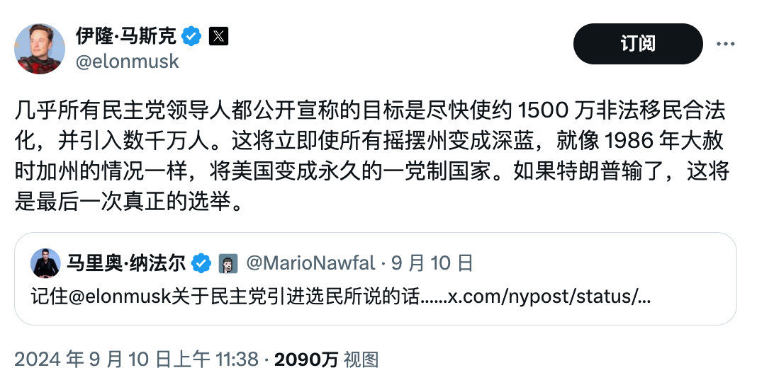 而 elon musk 刚刚在 x 力挺川普。而且,他说的的确是实话,川普可能是美国新教白人最后的机会。[汗]