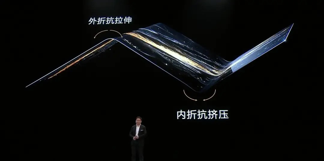 的确,除了意外情况之外,日常情况下,这块屏幕的要面临的挑战也不小。一面是外折一面是内折,注定让整个屏幕的应力会变得非常大。外折部分要抗拉伸,内折又要抗挤压。