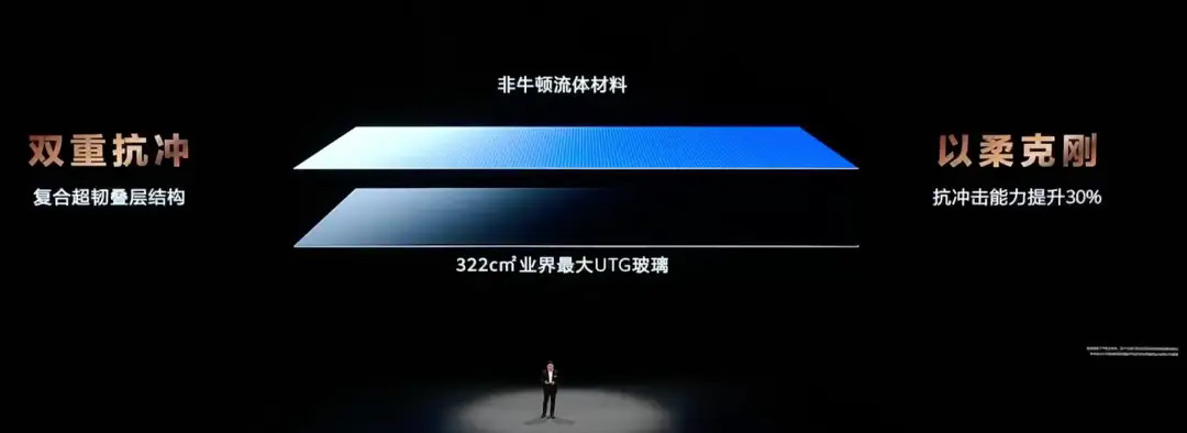 为了解决这些问题,华为同时给屏幕同时用上.UTG.玻璃和非牛顿流体,来提高屏幕的抗冲击性。